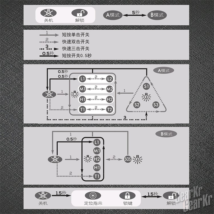 - 关机时长按开启最低亮度继续按压到关闭,指示灯红色闪烁锁定手电筒并开启定位模式(红色指示灯闪烁),再次单击关闭定位模式并继续锁定,长按开关解锁并开启最低亮度