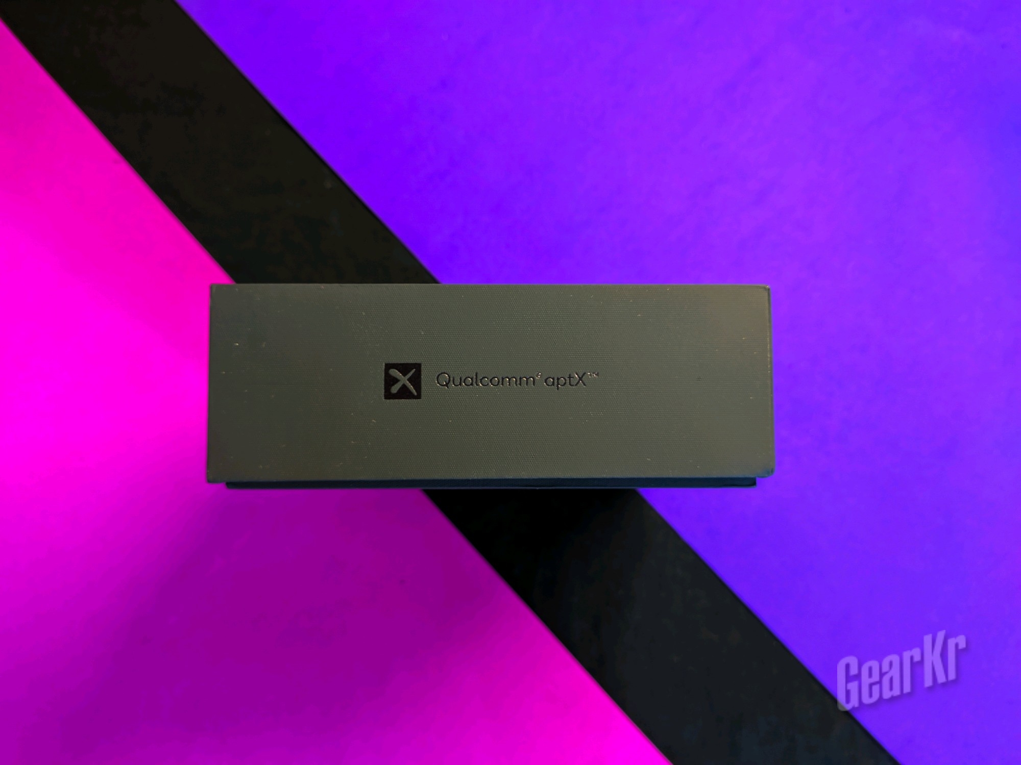 看到包装相比前代体积更大,上面用金色的烫金工艺印刷着品牌logo,下面有耳机的图片。侧面印有APTX和蓝牙的标识,背面也不出意外的印有产品参数。