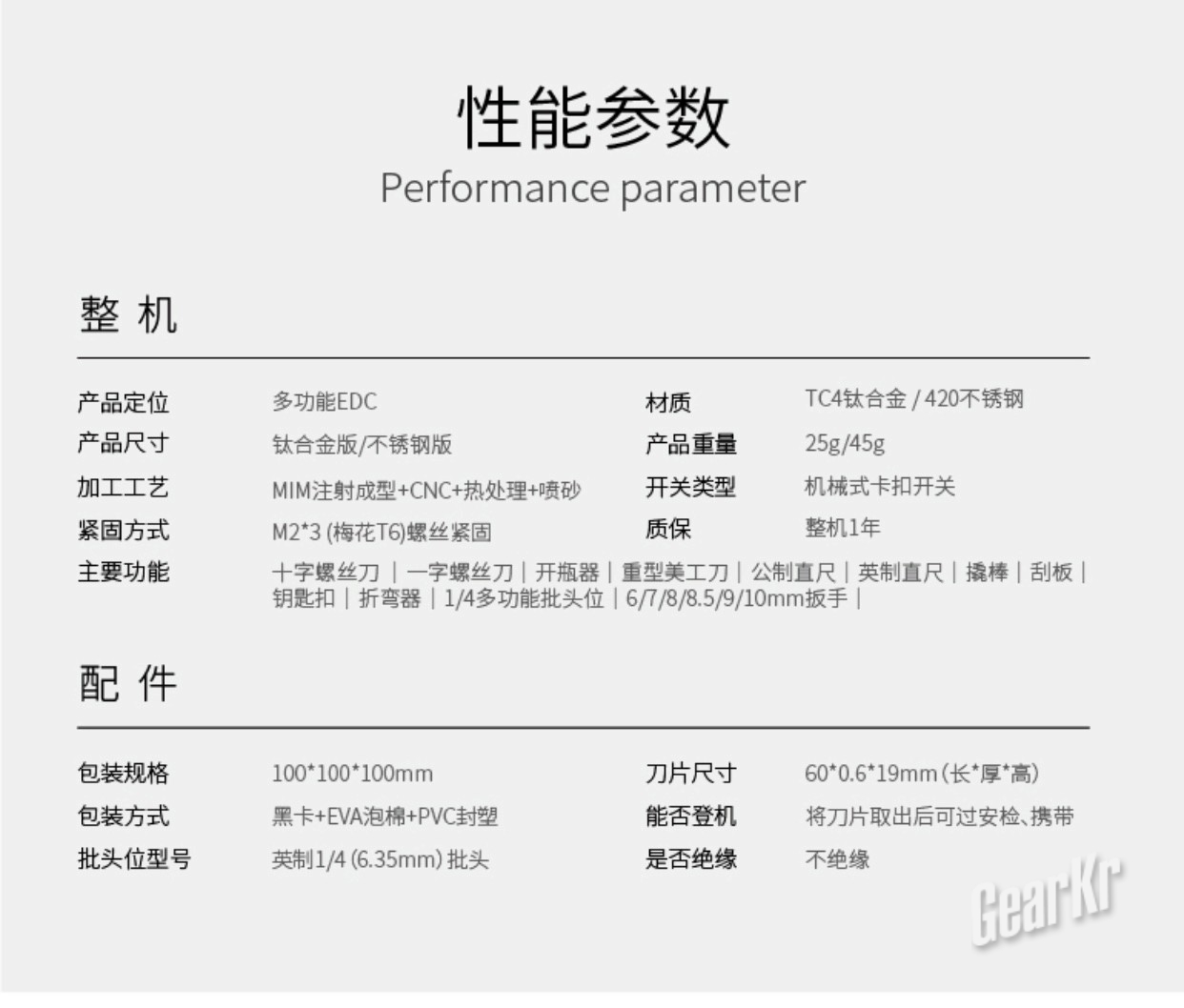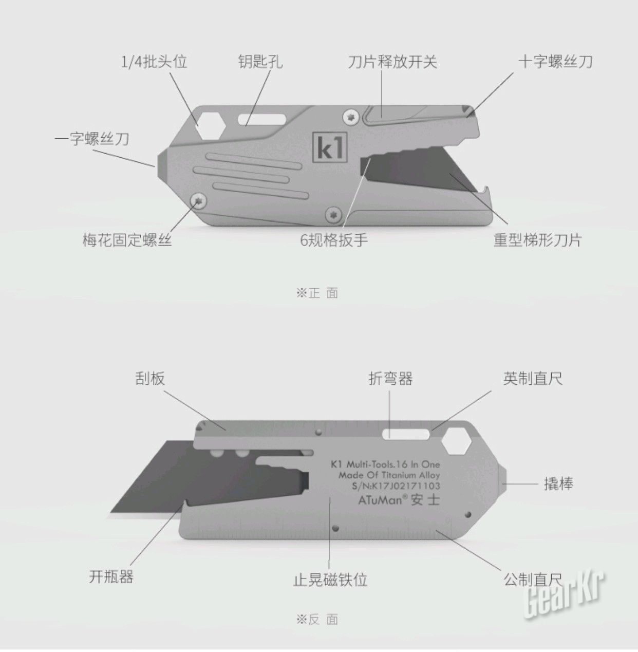从官方的介绍来看,k1s的功能十分全面功能介绍应该前代产品,但是大同小异,到了k1s这一代改良了刀片释放开关,将十字螺丝刀由上部移到了下部,更加符合了使用习惯。