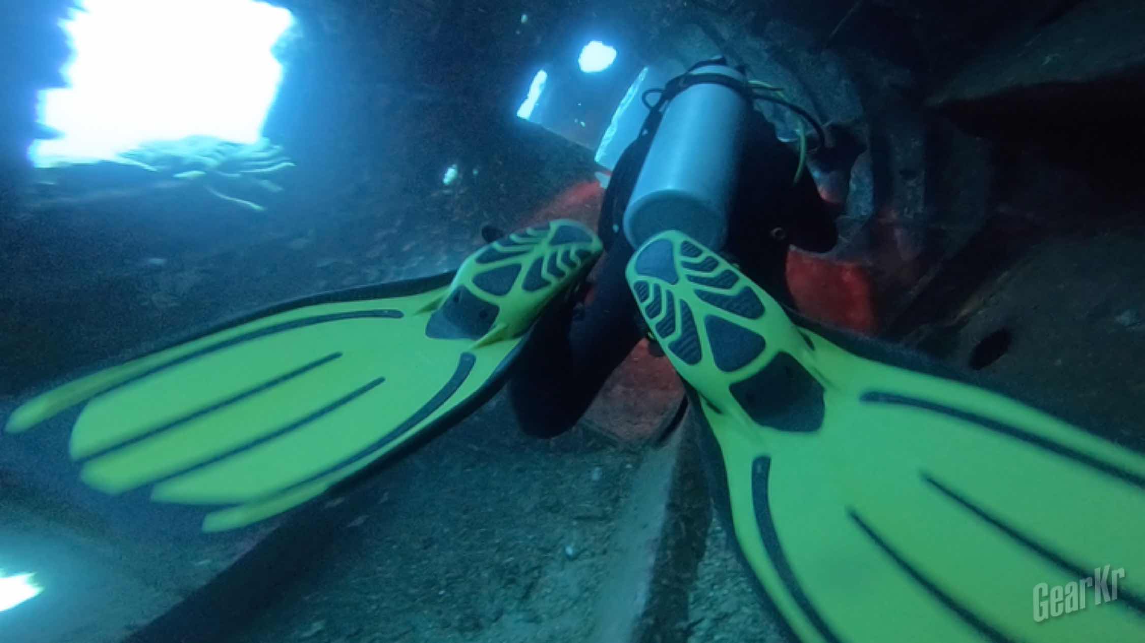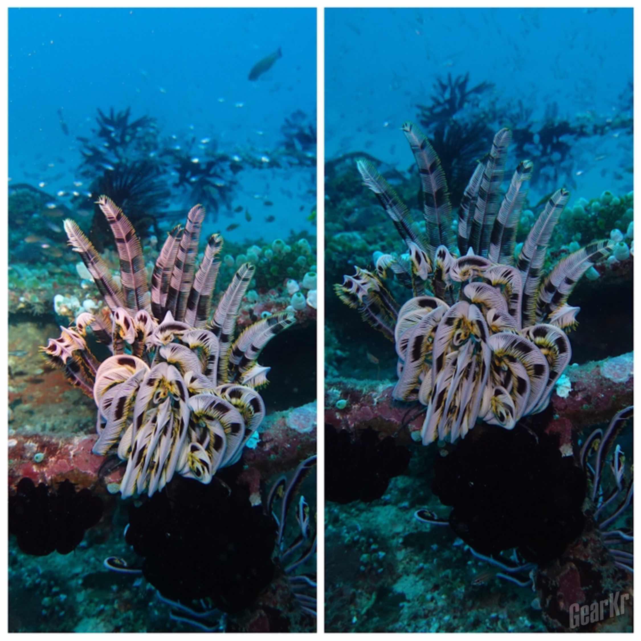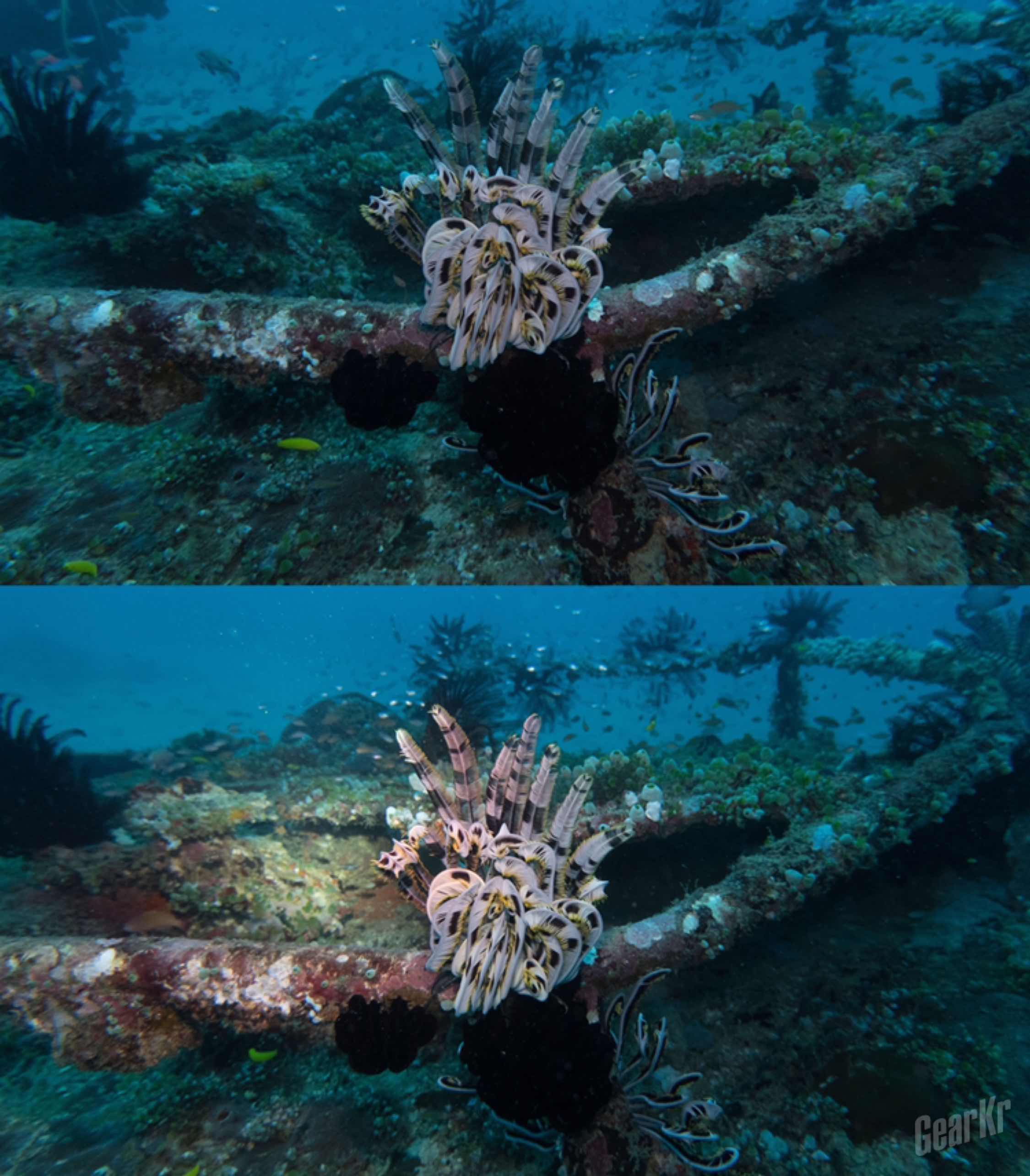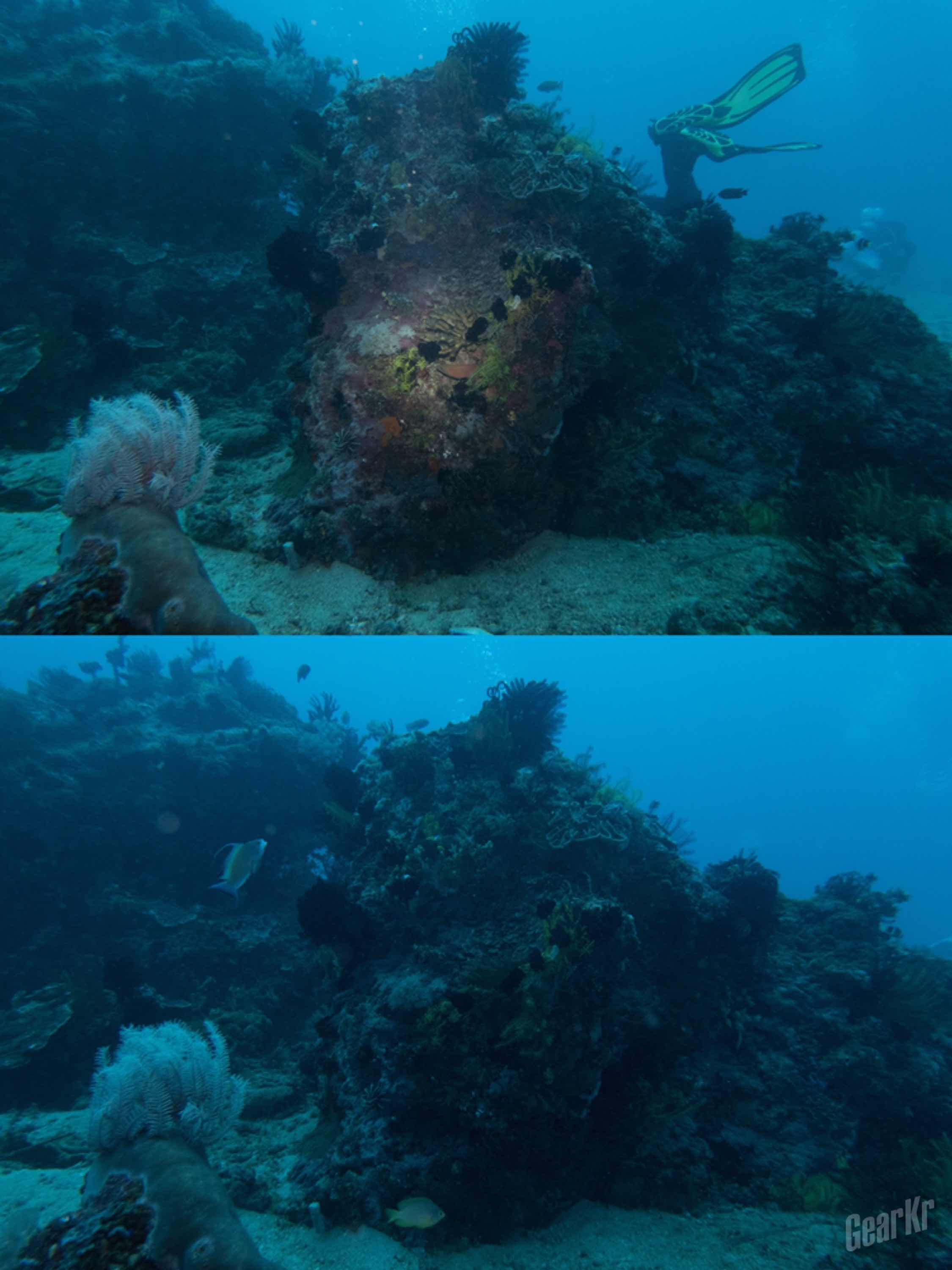 大约15米,天不是很好 所以水底的能见度就差了不少,这个时候的补光就变的非常有必要了,可以看到上图后面还有个潜水员,他的脚蹼已经看着和海底世界差不多,如果这个时候只靠肉眼去搜寻,就很容易错过了(下图那样),但这个红白光的相互配合倒是给予光线中央有明显的色彩还原并且附近也有“红一些”,所以一下可以看的还挺清楚,这个确实不错,但显而易见的另一个问题就是水底多亮都不嫌亮是真的,尤其是海况不好的时候。
