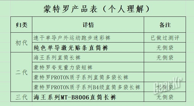 在我的记忆跟认知里(翻看了以往的测评使用),蒙特罗裤子在GearKr平台上过八次,我把之前测评过的速干单导户外运动跑步迷彩裤称之为“初代”,测试时间是2018年年末,2019年年初到2019年9月底这段时间的改进产品统称为“二代”,今天要测评的海王系列MT-B8006直筒长裤成为“三代”,归纳详情见下表。