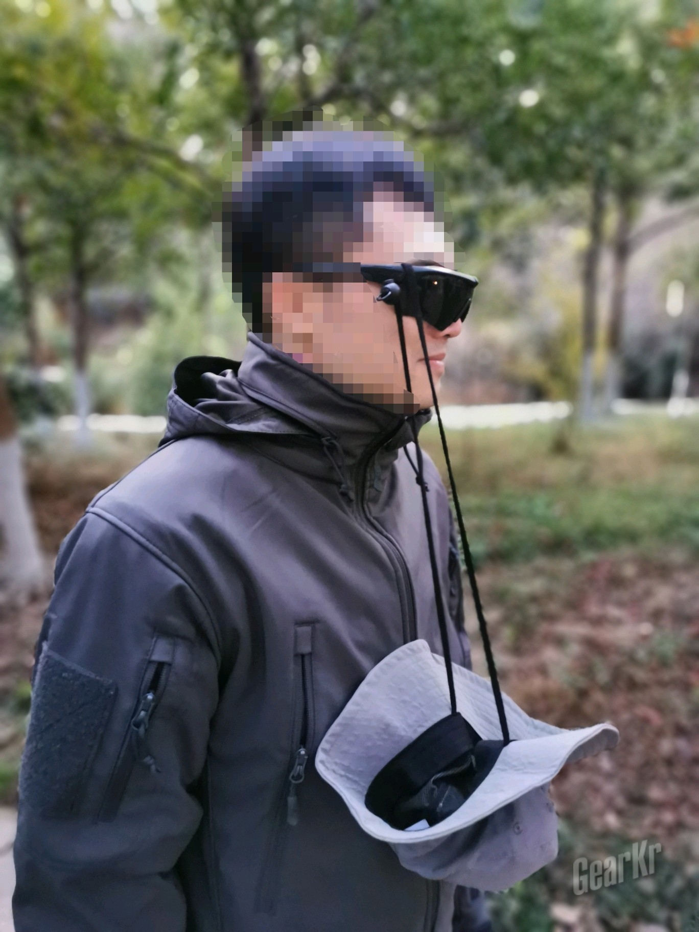 但是,在笔者拍完想取下帽子发生了如下事故,本着真实测试的原则,笔者随即让朋友拍下此幕。不仅如此,如果加上魔术头巾或者围脖、耳机、眼镜,结果就是各种缠…