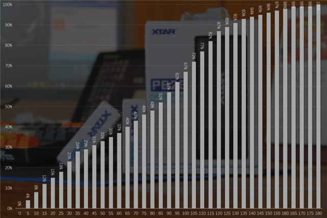 实测搭配联想的口红电源,对同时入手的这两只XTRA 21700 4300mAh电池进行充电,可以激活12V高电压充电协议,快充阶段功率最高超过20W,并可以长时间稳定维持在18W左右。两小时可充电至90%,三小时左右可以完全充满8600mAh电量。