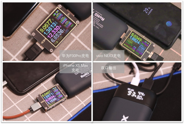实测中,为华为P30pro充电时,功率可以达到12W以上;为vivo NEX3充电时,功率10W左右;为iPhone XS max充电时,可激活APPLE 5V2A协议,功率10W左右。双口同时输出时,最大输出电流可达到3A左右。