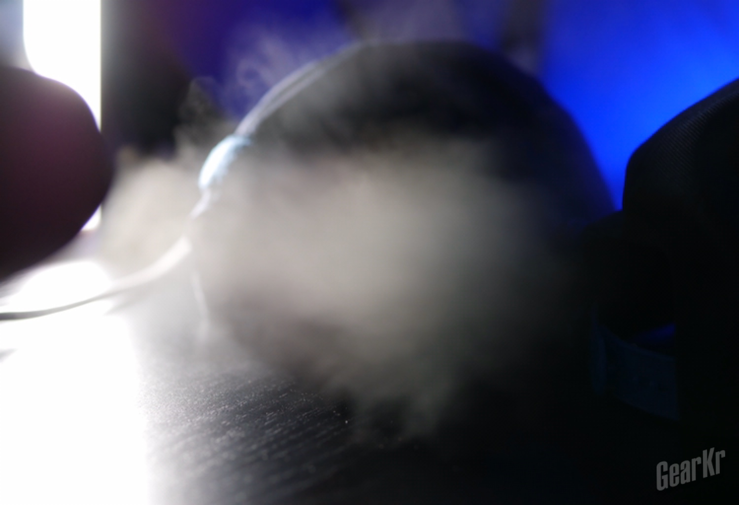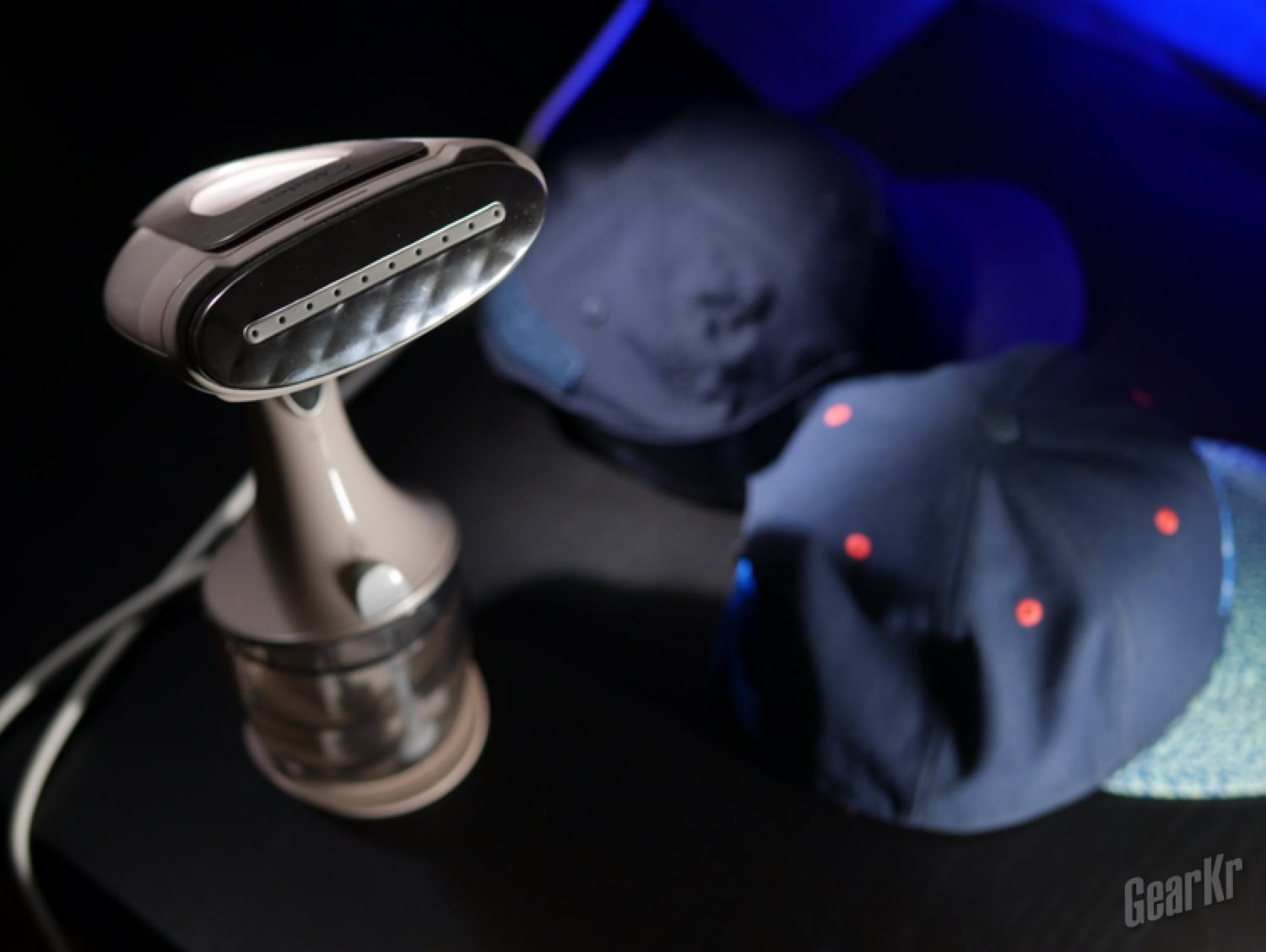 云雾一般的蒸汽喷射单导帽和我日常佩戴的棒球帽局部,把他们尽量喷热、喷湿(里外都喷上热蒸汽 )。