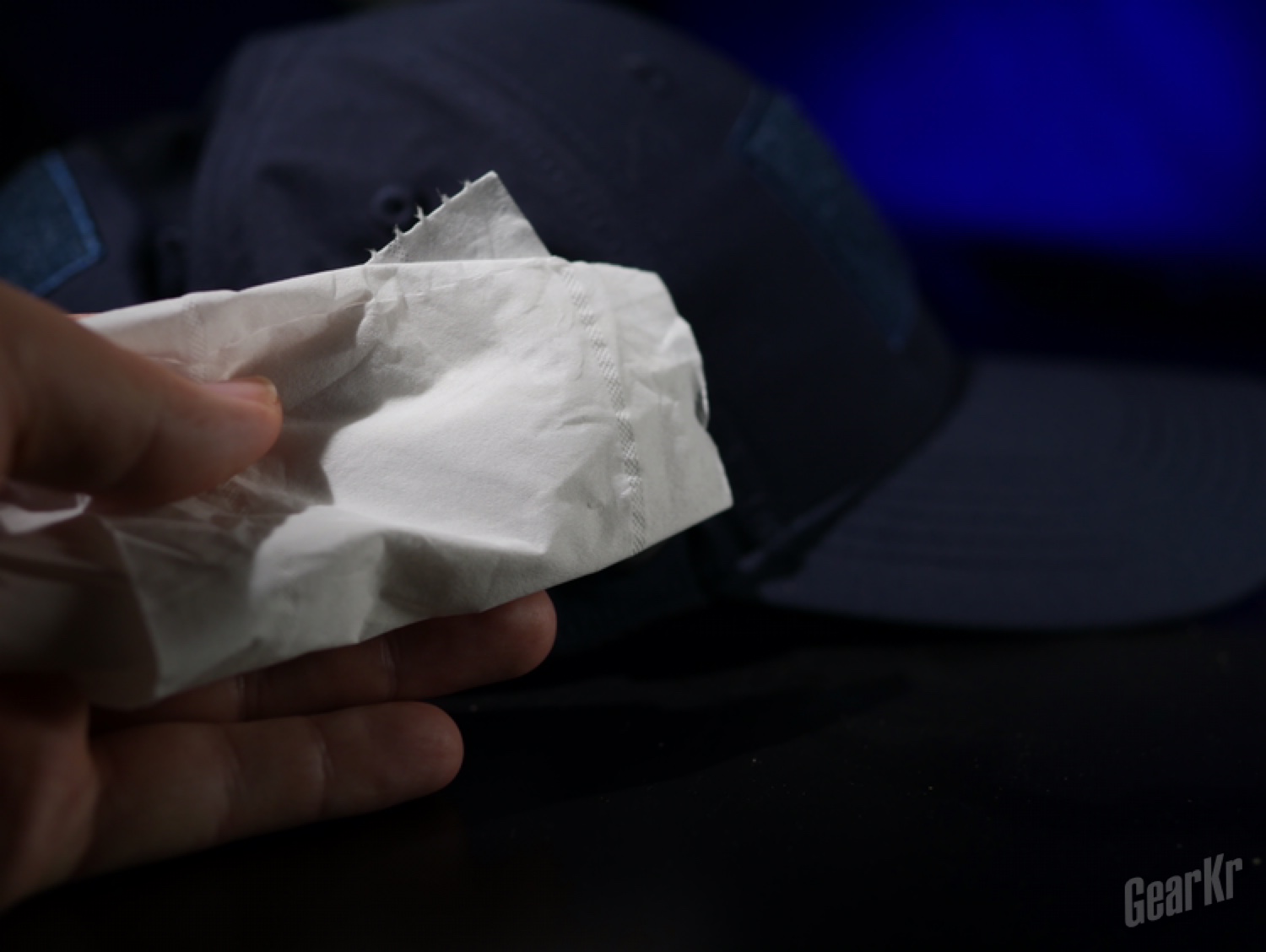 也是等了5分钟后,单导速调帽则完全相反,不但表面看不出湿润,而且卫生纸擦了下也没有水。实际上已经干了大部分,戴头上也没有湿润感。