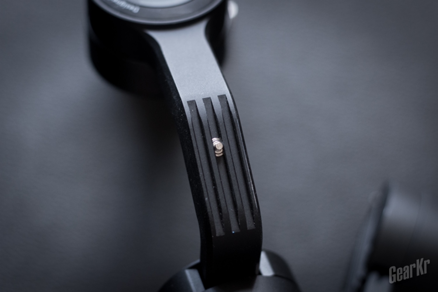 关于横滚轴和俯仰轴上的小圆圈的卡扣,是用于收纳的一个很巧妙的设计,航向轴有凹槽,和横滚轴臂表面的纹理对应,两者并列后就卡住了,同时一个横贯横滚轴臂的顶针就被顶出到俯仰轴臂上的凹槽,就锁定了俯仰轴,再锁定航向轴,这样三轴就都锁定在一条线,三位一体的感觉极其舒适!