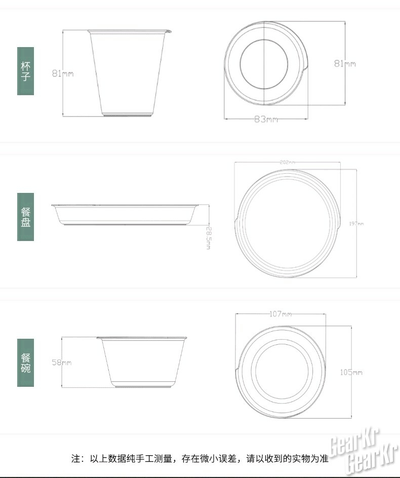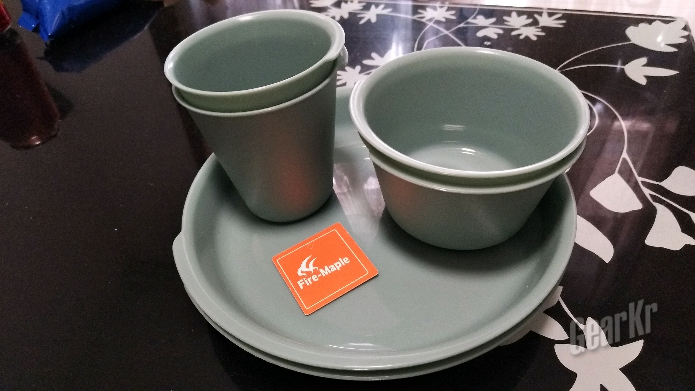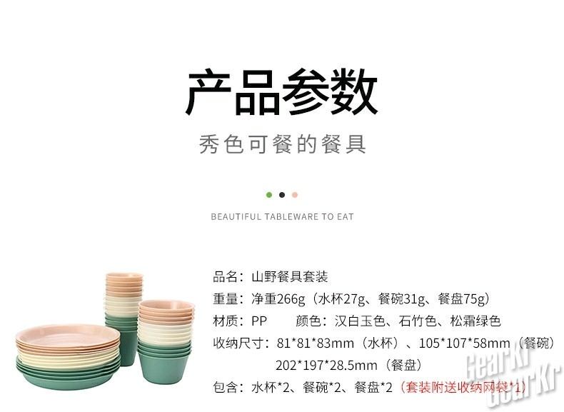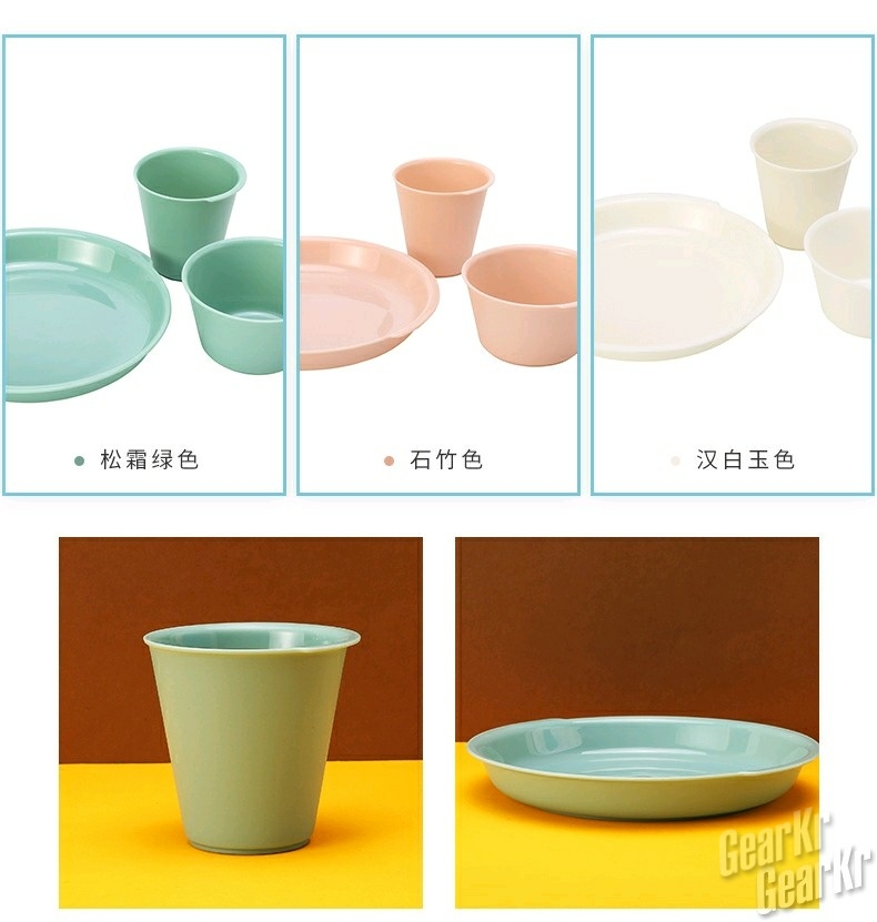 这是一款pp材质的户外餐具,包含小碗、盘子和水杯,一套为两组,适合两人标准出行使用,实际与火枫炊具附带的小碗一起可以提供多人户外用餐使用。火枫公司为这款餐具设计了松露绿色、石竹色、汉白玉色三种选择,白色显洁净,粉色可爱,绿色有韵味。