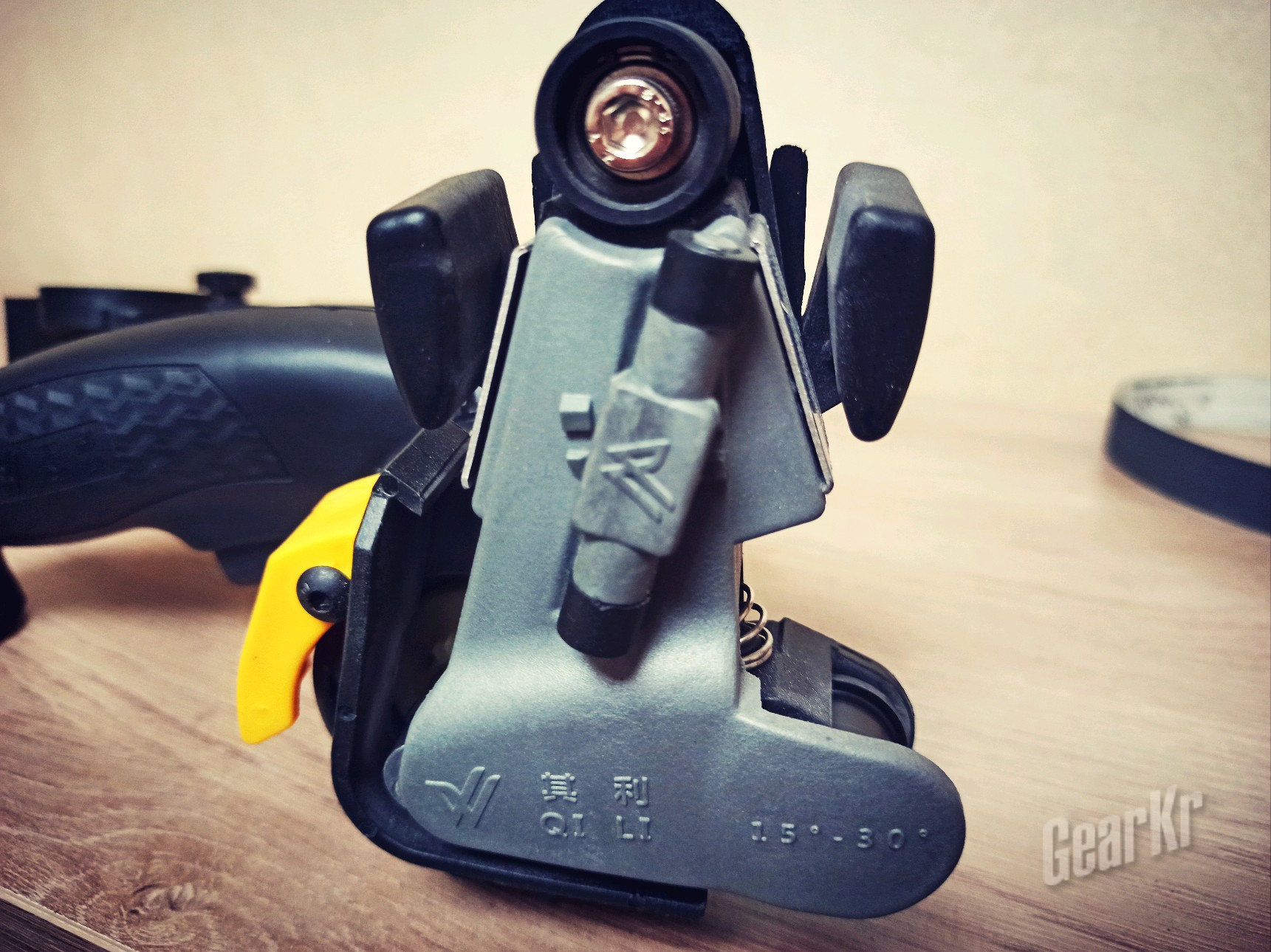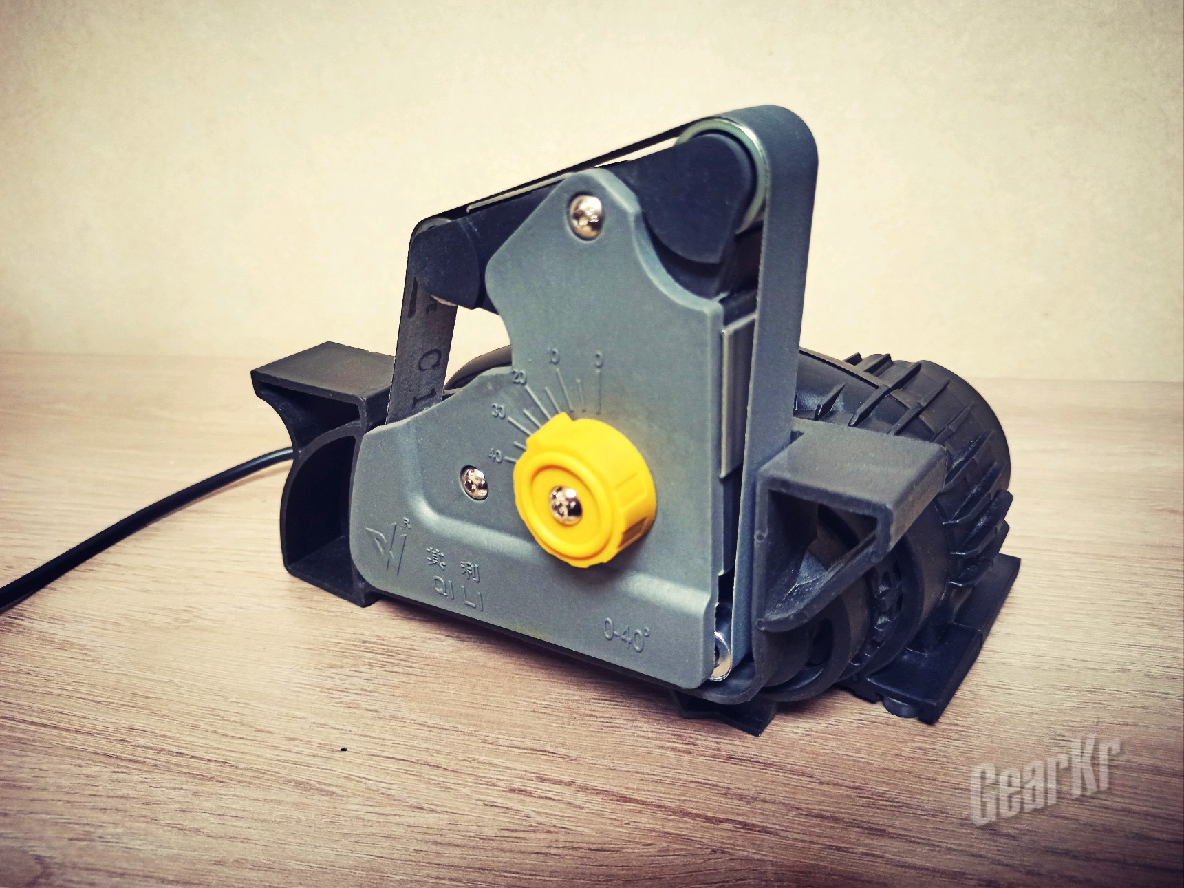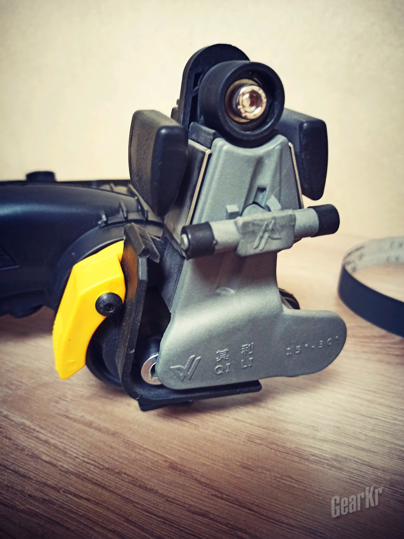 使用下来的感受就是三角台的定角器角度固定困难,紧了角度调节失灵,松了的话刀会被工作的砂带移动,带动定角改变角度,而且定角器的架刀角度小,不是所有的刀都能放进去,所以建议拆除,或者仅仅用它来给个别刀具进行刀刃的抛光处理和简单的锋利度恢复。