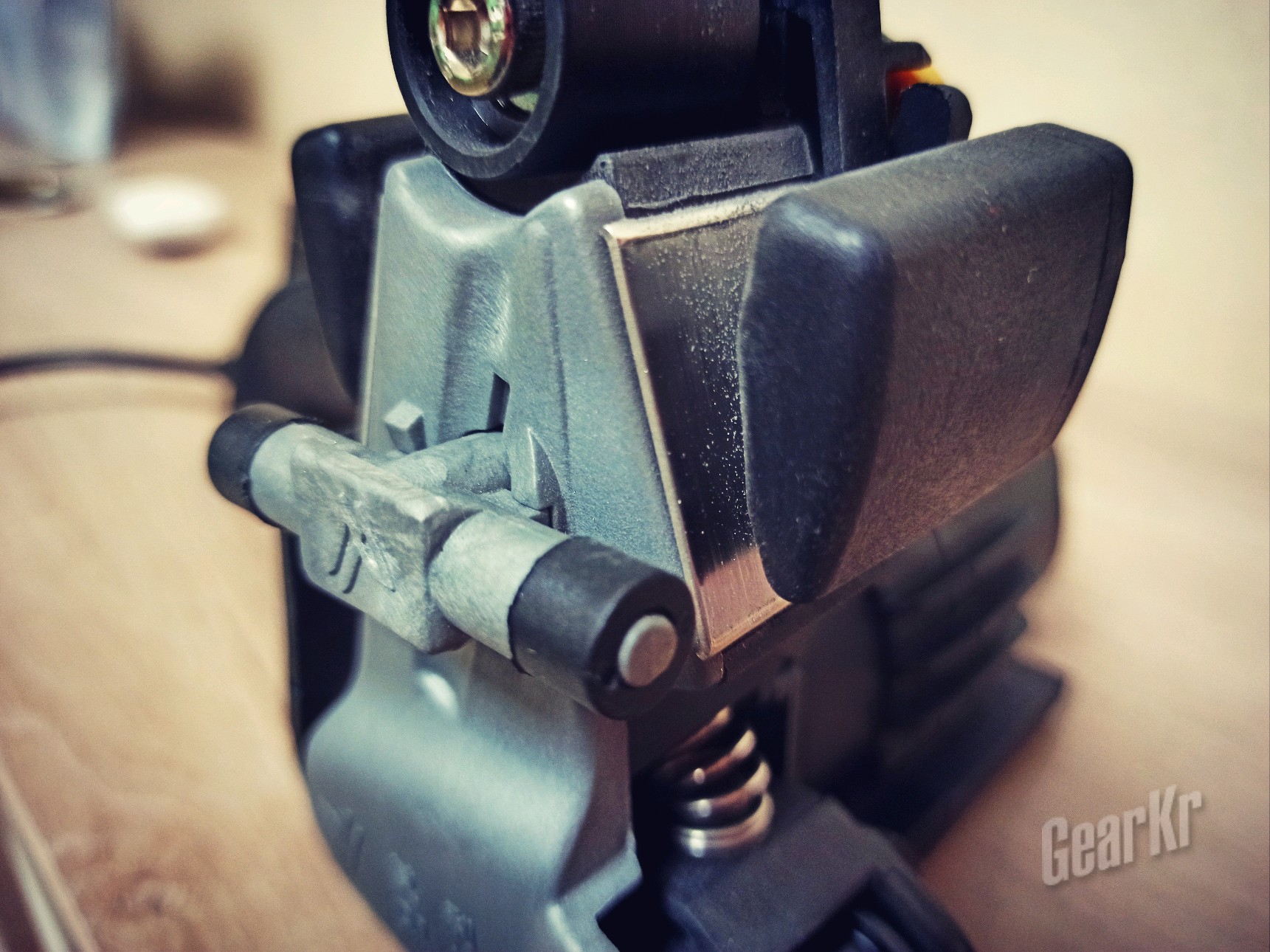 两个工作台都是通过主机的转动轴最为动力输出,所以在安装更换砂带的时候需要先把主机和工作台结合,再通过的弹簧涨紧轮安装砂带,值得一提的是两个工作台的涨紧轮扳扭都在左侧,挨着主机把手,操作有些扣手,希望厂家能做出修改。