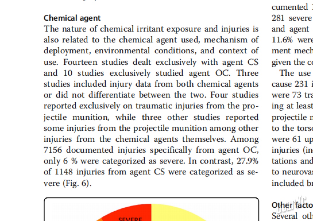 传统的CS制剂中由45%的CS药剂、30%的钾盐、氯酸盐,14%环氧树脂,7%马来酸酐,3%的2-甲基萘和0.03%的杂质组成。CS制剂本身就具有一定的毒性,在加入上述药剂中,它的毒性被得到了进一步提升。结果就是在1990年1月1日至2015年3月15日间,有5131人因为控暴剂受伤,其中两人死亡。58人终身残疾,在9261名伤员中,8.7%为重症,需要专业医疗管理,17%为中症,74.3%为轻症。虽然这些伤害大部分都是由抛射性的弹药直接打击造成的,但是在仔细检索后,直接由CS制剂造成的1148起伤害案例中,重症占到27.9%,远高于OC制剂6%的重症率。由于种种原因,条子们开始寻找一种新的控暴剂。