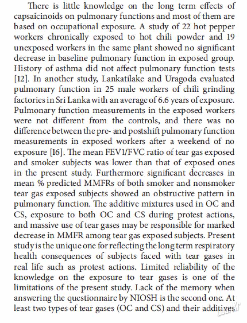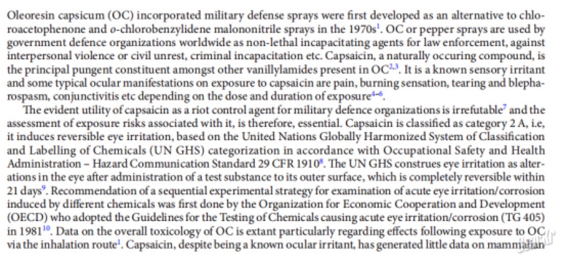 很快,他们得到的答案是:OC。OC是提取自植物中的天然刺激性物质,就是我们耳熟能详的辣椒素。OC比起CS有许多优势,比如它比CS起效更快,能在1~2秒内产生剧烈的痛觉,而CS则需要3~7秒(在常温下的实验,考虑到CS制剂一般需要加热,在实际使用中起效或许会更快),它可以用水基型载体喷射,比起需要加热的CS无疑更安全。在毒理学方面,尽管OC会在产生疼痛与烧灼感的同时会导致流泪和眼睑痉挛、结膜炎或虹膜炎、组织渗透性异常、角膜混沌或增厚、结膜红肿或水肿等症状,但这些症状中的大部分都是短期内可逆的,其中角膜肿胀和红斑在72小时内即可消退,动物实验和流行病统计学显示OC导致的作用时间和慢性病隐患不会像CS那样漫长而不可控。即便OC制剂中的其他辅料,包括醇类等有机溶剂,以及如氟利昂、四氯乙烯和亚甲基氯化物等卤代烃或推进剂的使用可能会造成更深远的皮肤渗透或更严重的刺激性,使得分析OC制剂在实际使用中的毒性变得更加更复杂,但是从总体上来说,OC制剂的安全性明显优于CS和CN制剂。成为了新一代控暴剂的首选,各国在70年代开始便大量采用OC作为警用控暴剂。