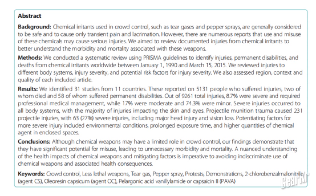 最后要说的是CN,老实说我不愿意在CN的话题上浪费太多时间,因为这玩意儿已经处于被淘汰的边缘。CN不仅可导致皮肤出现红疹、烧伤和其他皮肤病,而且还是一种潜在的致癌物质。CN通过刺激人眼上方和侧面的泪腺来使人不断流泪来达到使沾染人员难以睁眼的目的,CN还能刺激鼻腔导致鼻涕大量流出,还会使皮肤上裸露伤口的伤势恶化。基本上CN对比CS和OC一无是处,除了起效时间比CS来的要短外(1~3S内起效),它的持续性和制服能力比不上CS,使用CN制剂进行执法也更容易出现安全事故,现在只有少数厂家还在坚持使用CN作为控暴剂。