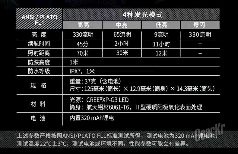 K3RT采用CREE XP-G3 LED光源,最高亮度达330流明,中亮65流明,低亮9流明,兼具330流明爆闪。下面引用官方介绍,具体数据如下: