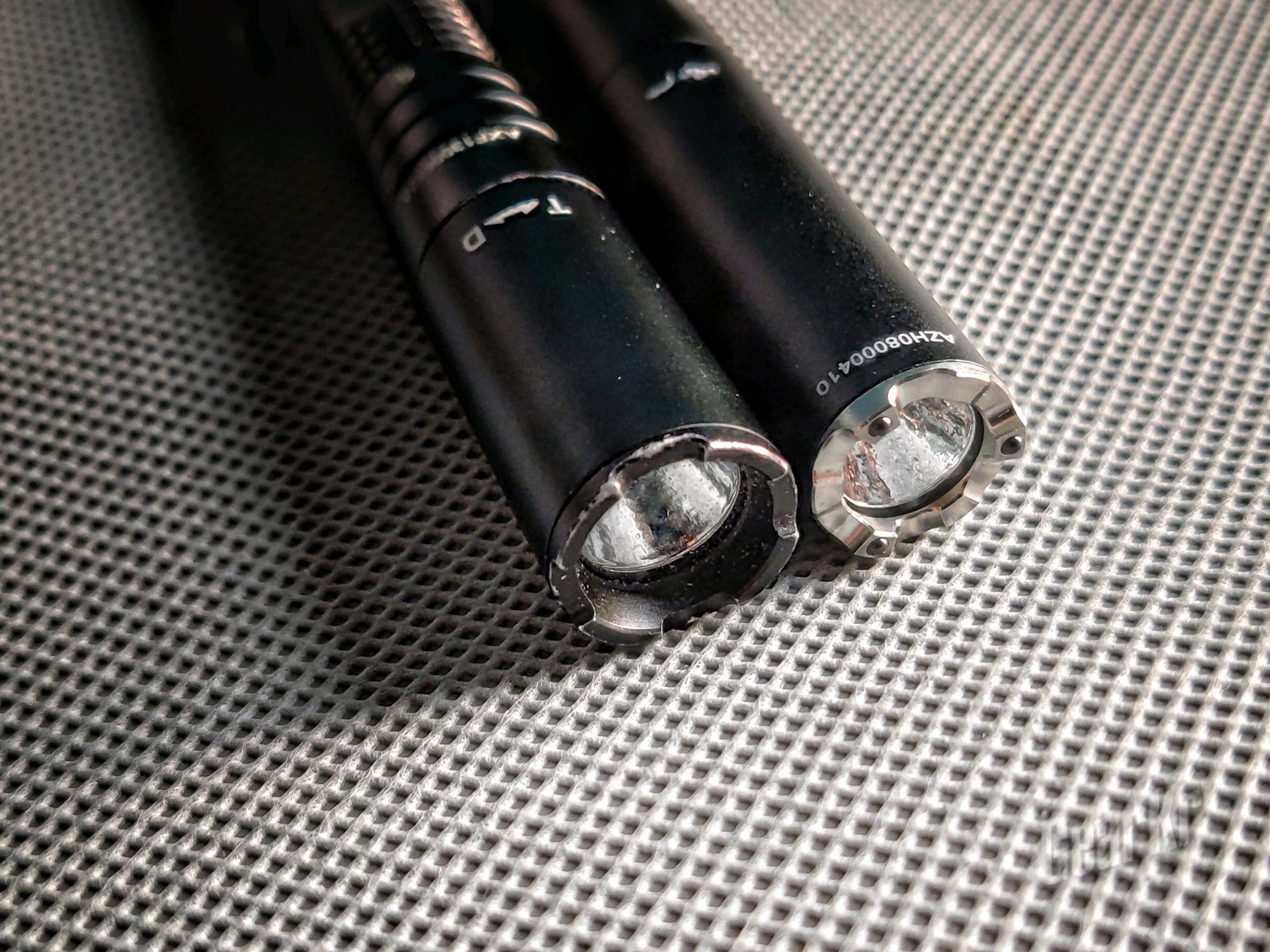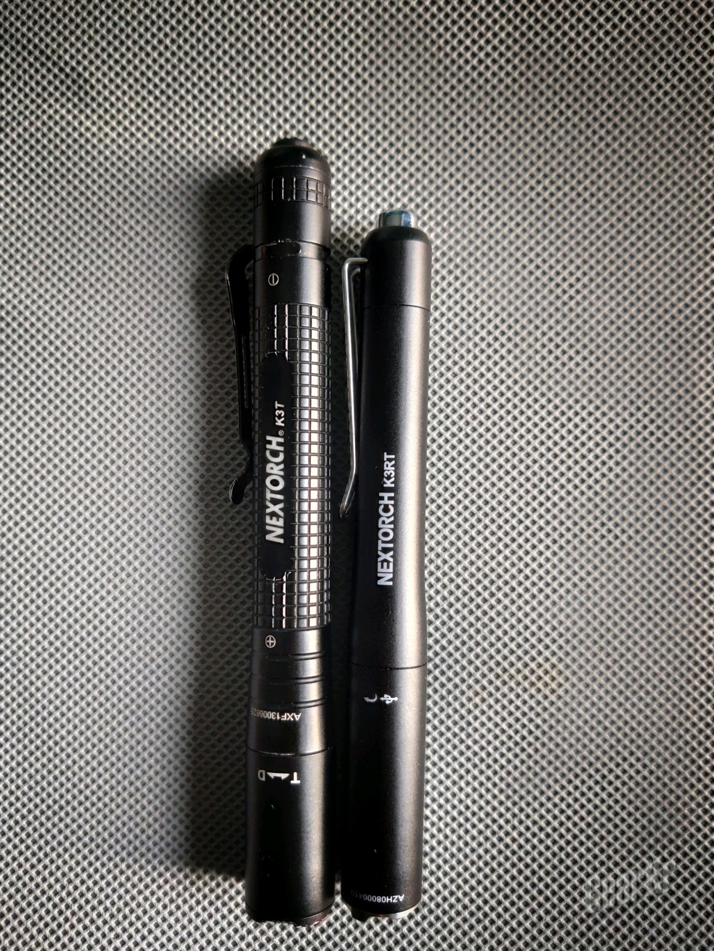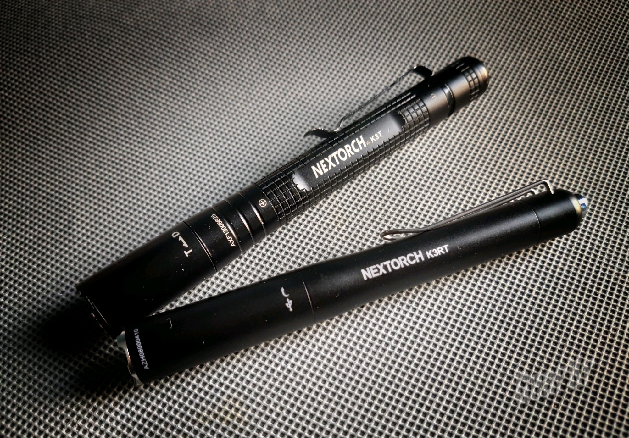 之前本人也有一款使用频率非常高的笔形手电K3T,基本上是我在日常通勤中都会随身携带。下面两者做个简单对比首先从外观上对比,K3RT比K3T更短一些,无论是放上衣口袋还是裤兜,K3RT明显优势更大一些。K3T筒身有防滑纹,风格硬朗,战术范十足,握持上更加稳固些,在这点上我更倾向K3T。