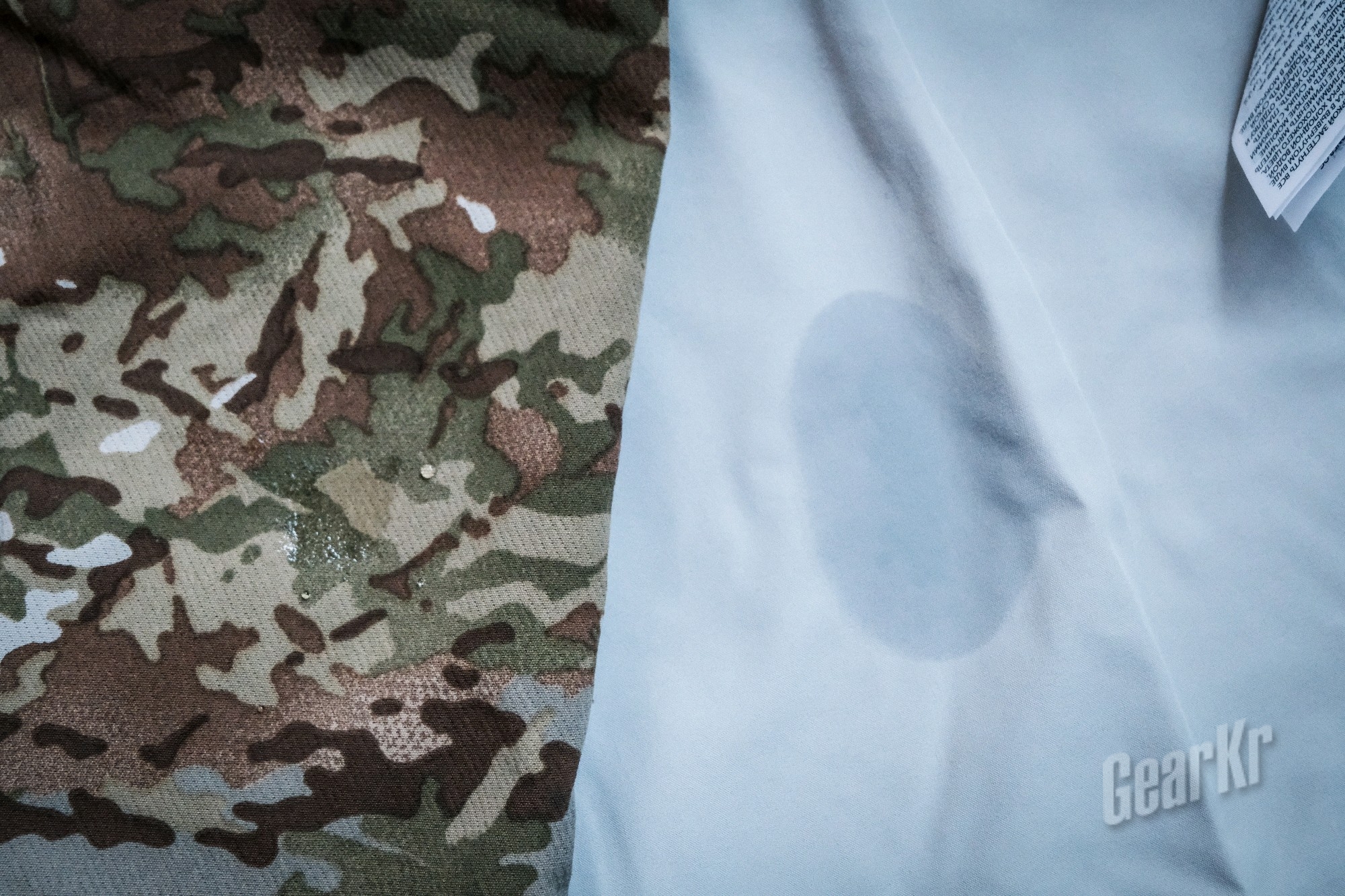 5.11的面料在吸水方面似乎更占优势,水滴在上面马上就被吸收散开了。而单导面料会短暂的在上面形成荷叶现象,水珠停留一段时间后被吸收。