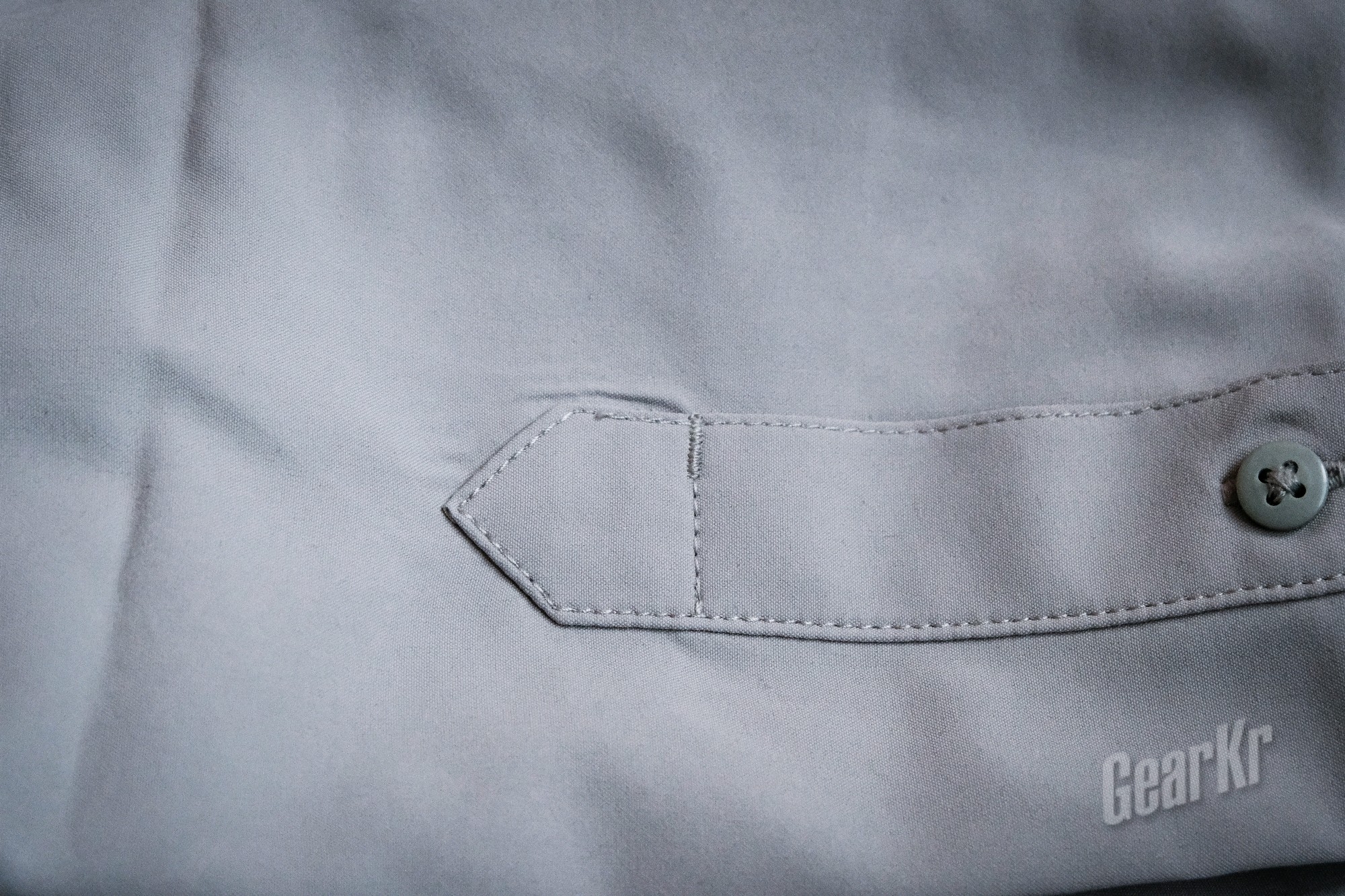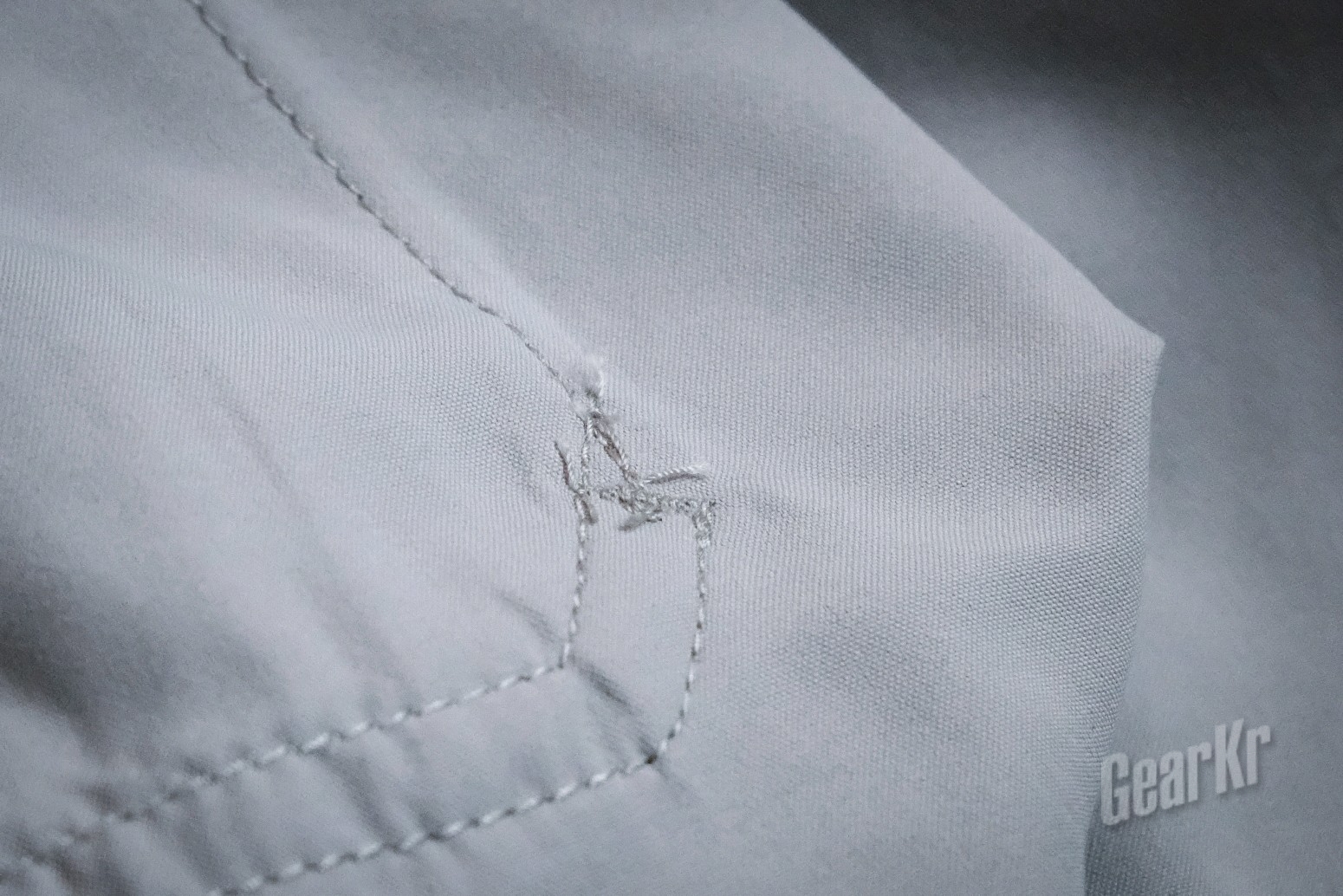 这个口袋盖扣子设计的比较有意思,相较于传统衬衫竖着开一道口子来塞纽扣,神射手是横着开了一个孔,这样的设计更方便解开和系扣子。