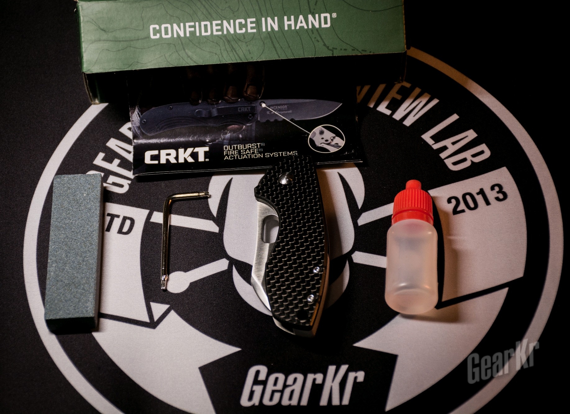 如图,盒子里的东西确实不少,一张说明书,一块我估计永远也不会用到的超级粗的磨刀石,一支拆刀子用的螺丝刀,折刀本体,一瓶我也不知道干嘛用的油。