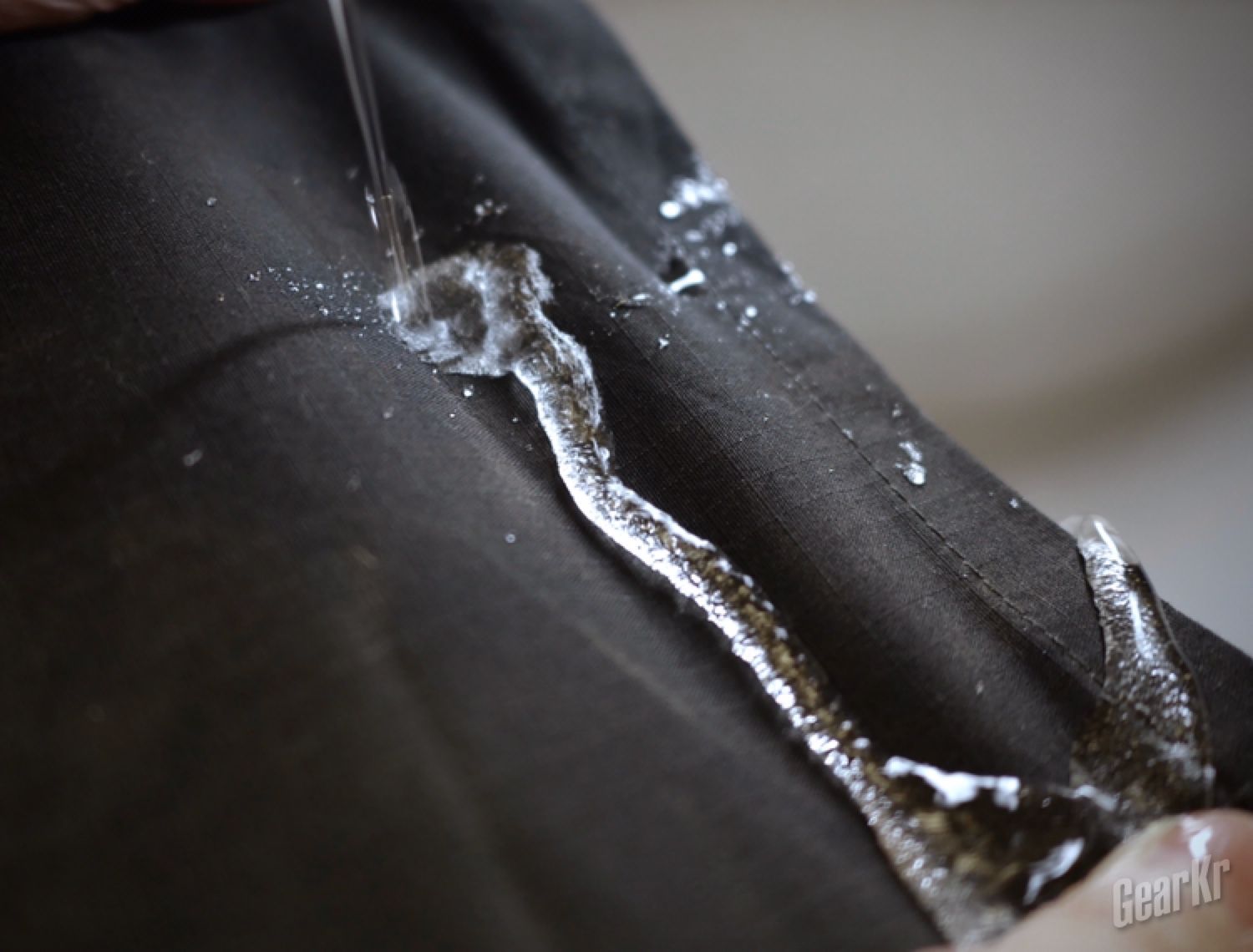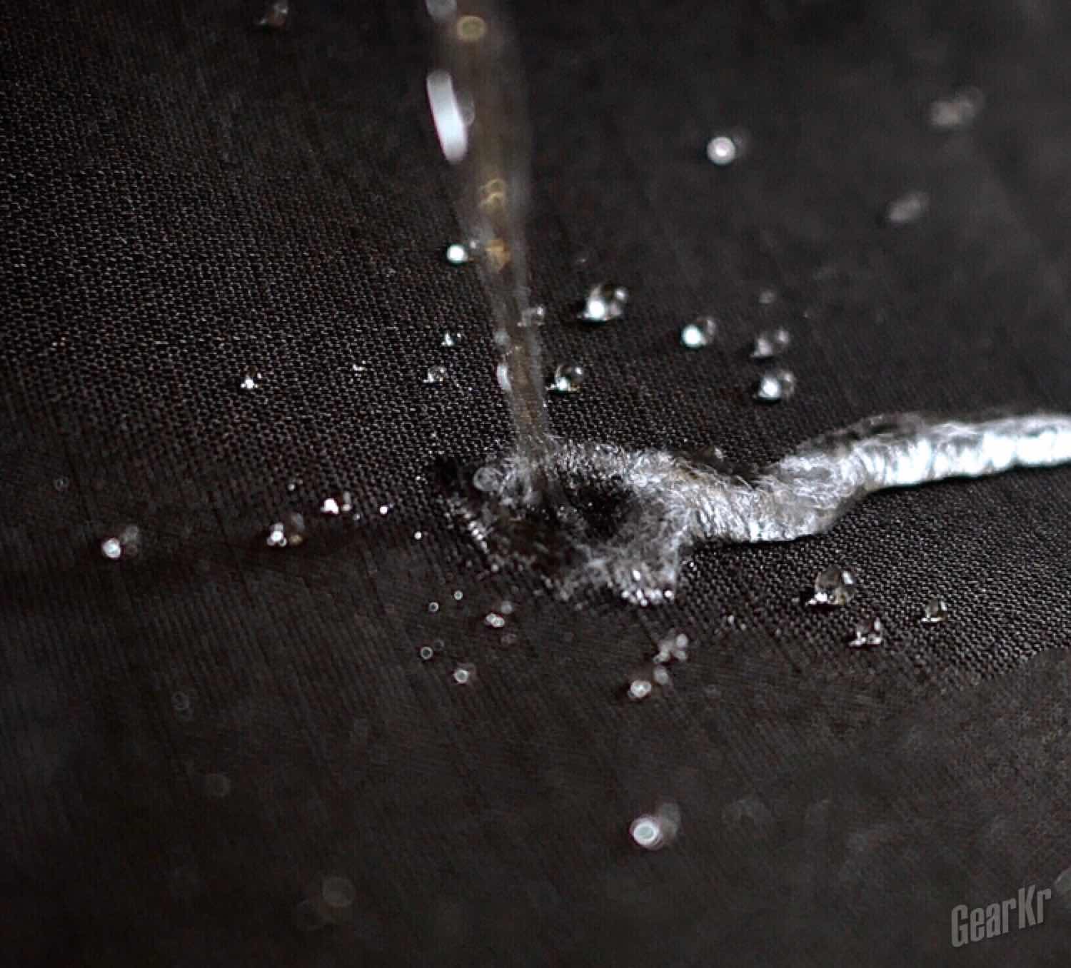 稍微快速水龙头冲一下,里面也没有透湿,还是很不错的(注意:只是防泼水和轻微小雨,又不是雨衣 !长时间大冲击力的水流久了肯定会些许透过的)防泼水涂层的更大意义在容易清洁和不沾染赃物!