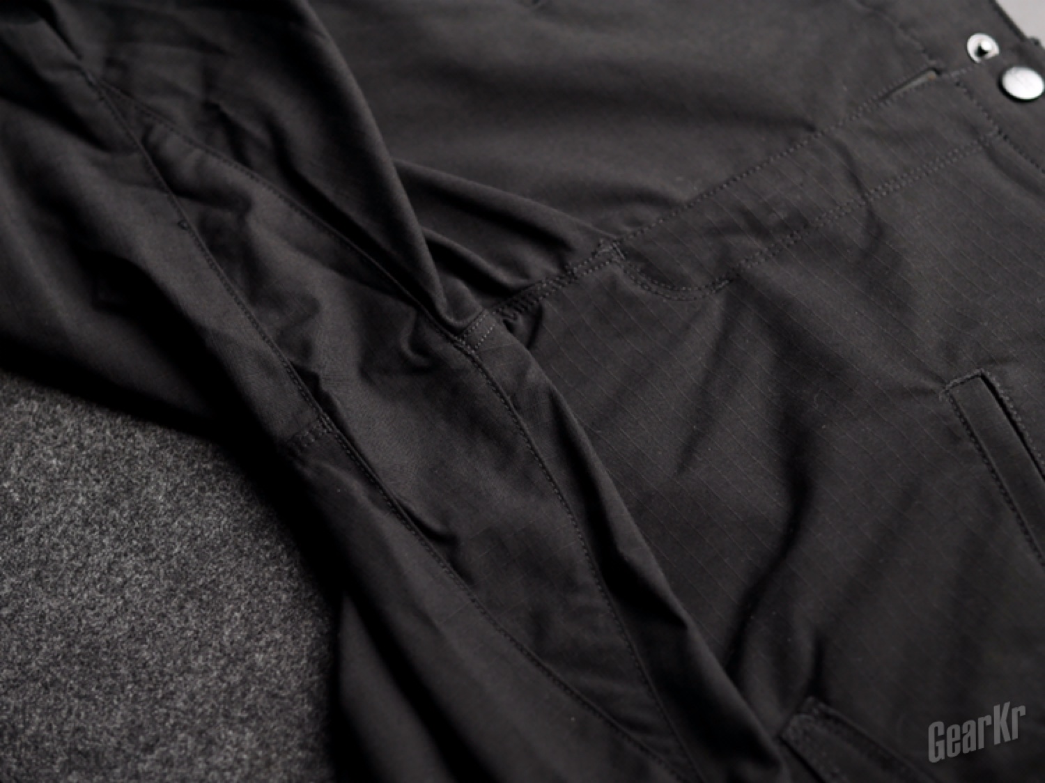 胯骨侧面是和硬朗布料相对的超级有弹性的透气面料,减少闷热的同时加大裤腰的弹力。