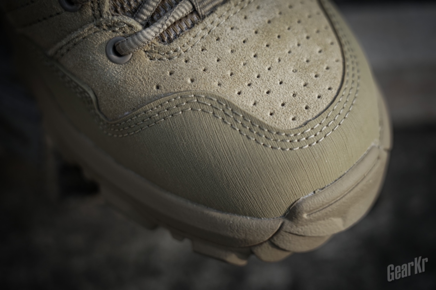 鞋头补强可以用来保护脚趾,户外踢到大石头,工作时不小心碰到设备机器都能够起到保护作用。补强是采用的不规则的形状,穿上一双鞋的时候也不是太理解这个形状是什么意思,后来使用过后发现有两个作用,一是这个位置骑摩托会有磨损,加强后会防止过快磨烂;二是在下雨天走的时候,泥水基本不会超过补上的范围,特别是拇指多出来那点,非常有意思。